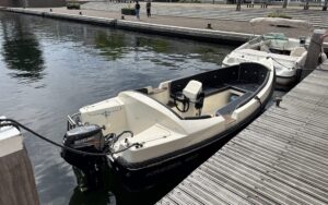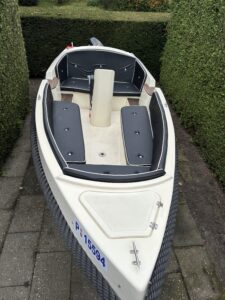 Deze Krezel is uitgerust met een krachtige 15 PK buitenboordmotor met elektrische start. Hiermee vaart de boot met vier personen aan boord toch nog rond de 16-20 km/uur.