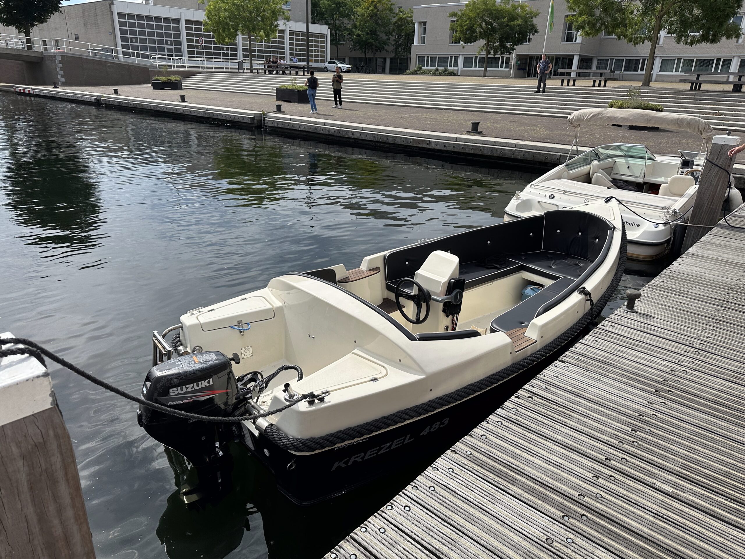 Deze Krezel is uitgerust met een krachtige 15 PK buitenboordmotor met elektrische start. Hiermee vaart de boot met vier personen aan boord toch nog rond de 16-20 km/uur.